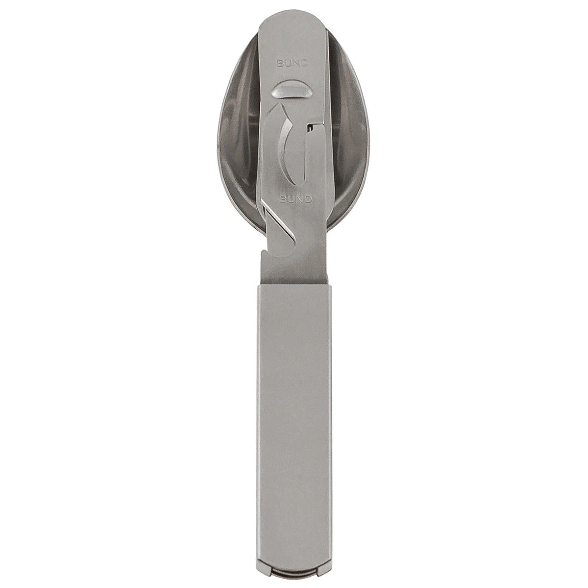 Bundeswehr Outdoor Essbesteck in schwerer, hochwertiger Ausführung aus rostfreiem Stahl. Das 4-teilige Feldbesteck oder Camping Besteck besteht aus Löffel, Gabel, Messer und Spezialhalterung mit Flaschen- und Büchsenöffner, die platzsparend zusammensteckbar sind.