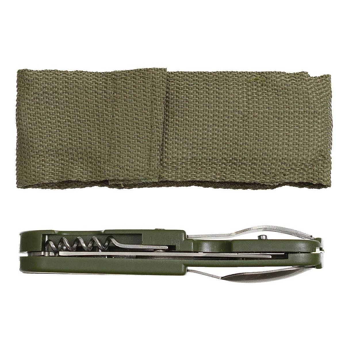 Das Camping Multitool oliv von Fox Outdoor beinhaltet ein vollständiges Besteck-Set mit Klappmesser, zusätzlich ausklappbarem Flaschen- und Dosenöffner und einem Weinöffner. Ausserdem können Löffel und Gabel aus dem Multitool gezogen werden. Messer, Gabel, Löffel usw sind kompakt im Multitool zu verstauen und können dann in der Nylon Gürteltasche transportiert werden.