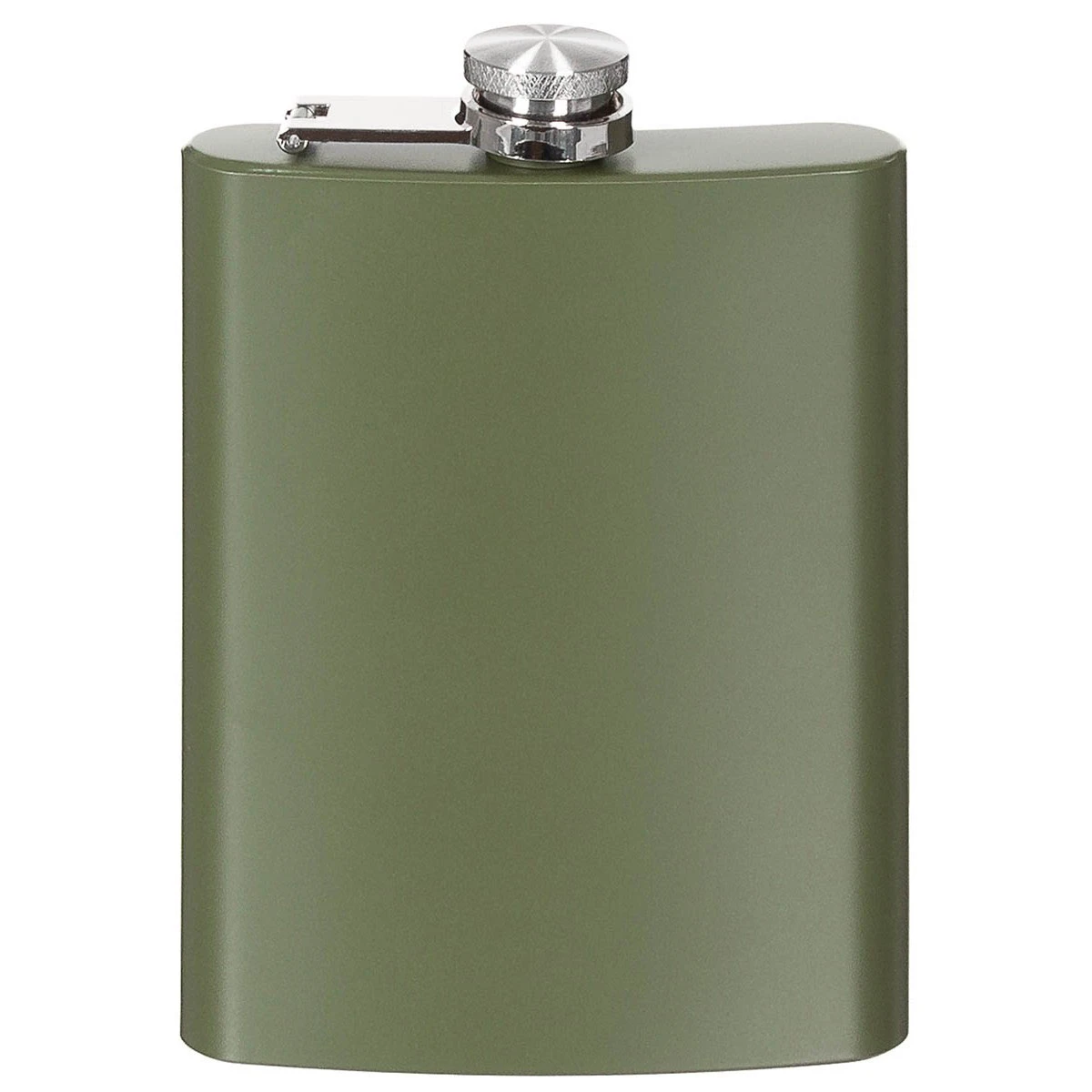Edelstahl Taschenflasche aus oliv lackiertem Edelstahl mit praktischem Schrauberschluss von Fox Outdoor. Der Schraubverschluss ist per Gelenkverbinder an den Flachmann befestigt und kann so nicht verloren gehen.
