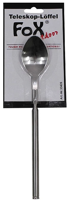 Der Teleskop Löffel von Fox Outdoor kann von 20,5cm bis Gesamt 63cm „ausgefahren“ werden. Der Löffel findet z.B. Verwendung zum Rühren von Suppe auf Großtöpfen am offenen Lagerfeuer um so einen Gewissen Sicherheitsabstand zu haben.