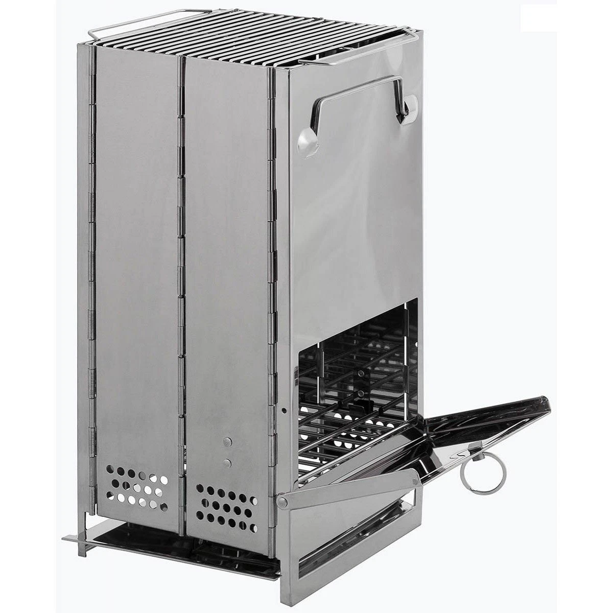 Der Raketenofen klein aus Edelstahl mit einer Höhe von H=43cm ist die ideale Kochstelle für unterwegs. Der Faltherd ist sehr kompaket zusammen faltbar und mit wenigen Handgriffen auf oder wieder platzsparend abgebaut. Die kaminartige Bauweise des Raketenofen mit der Luftzufuhr von unten lässt das Brennmaterial wie Holz, Trockenbrennstoff usw. sehr effektiv abbrennen und bringt die Hitze direkt an den Rost. Die präzisen Einschnitte im Material fungieren als Dehnungsfugen und versorgen das Feuer mit ausreichend Frischluft. Mit dem Ofen kann unterwegs gegrillt, gegart oder gekocht werden. Der Faltherd ist leicht auf- und abbaubar, zudem sind alle Teile aus Edelstahl und lassen sich dadurch hervorragend reinigen. Weiter bietet diese Variante gegenüber einem Lagerfeuer neben der Effektivität den Vorteil, dass die verbliebene Asche sauber im herausnehmbaren Ascheblech bleibt und keine Brandstellen am Boden hinterlässt. Über 2 Klappgriffe kann der Raketenofen bequem getragen werden. Für den Transport befindet sich eine praktische Transporttasche im Lieferumfang.
