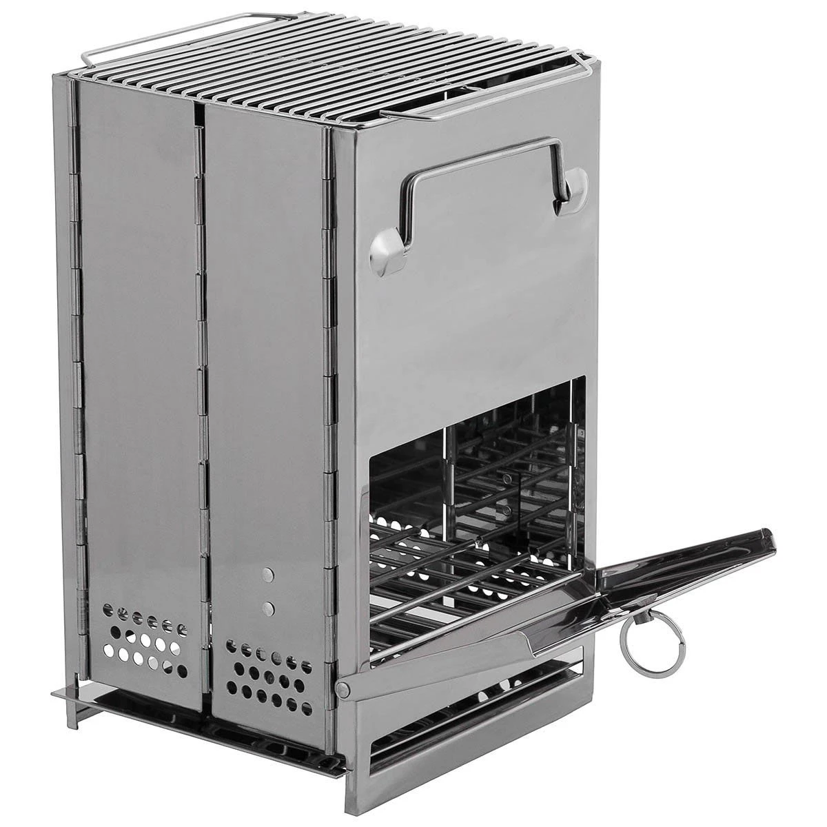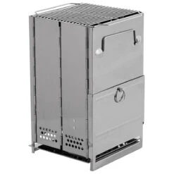 Der Raketenofen mittel aus Edelstahl mit einer Höhe von H=35cm ist die ideale Kochstelle für unterwegs. Der Faltherd ist sehr kompaket zusammen faltbar und mit wenigen Handgriffen auf oder wieder platzsparend abgebaut. Die kaminartige Bauweise des Raketenofen mit der Luftzufuhr von unten lässt das Brennmaterial wie Holz, Trockenbrennstoff usw. sehr effektiv abbrennen und bringt die Hitze direkt an den Rost. Die präzisen Einschnitte im Material fungieren als Dehnungsfugen und versorgen das Feuer mit ausreichend Frischluft. Mit dem Ofen kann unterwegs gegrillt, gegart oder gekocht werden. Der Faltherd ist leicht auf- und abbaubar, zudem sind alle Teile aus Edelstahl und lassen sich dadurch hervorragend reinigen. Weiter bietet diese Variante gegenüber einem Lagerfeuer neben der Effektivität den Vorteil, dass die verbliebene Asche sauber im herausnehmbaren Ascheblech bleibt und keine Brandstellen am Boden hinterlässt. Über 2 Klappgriffe kann der Raketenofen bequem getragen werden. Für den Transport befindet sich eine praktische Transporttasche im Lieferumfang.