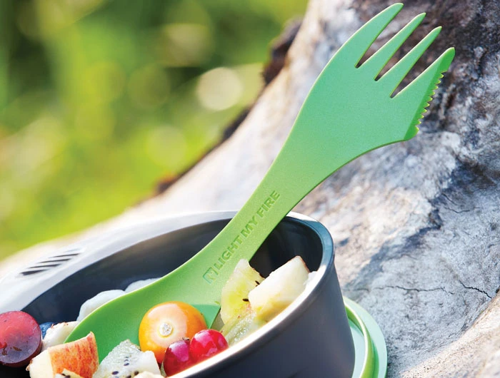 Der Original LightmyFire Spork Bop ist eine geniale Kombination aus Löffel, Messer und Gabel. Der Spork ist das perfekte Outdoor- und Campingbesteck, löst unterwegs große und kleine Probleme und spart enorm Platz. Der Spork Original aus Tritan ist extrem langlebig, spülmaschinenfest, leicht und für den Gebrauch von Anti-Haft beschichtetem Geschirr geeignet. Mit dem Löffel an einem Ende und der Gabel mit gezackter Messerkante am anderen Ende ist es ein vielseitiges, wiederverwendbares und kompaktes Besteck für jedes Lunchpaket, jeden Picknickkorb, jede Handtasche und jeden Rucksack. Der Light-my-Fire Spork sollte bei keiner Outdoortour und in keinem Rucksack fehlen.