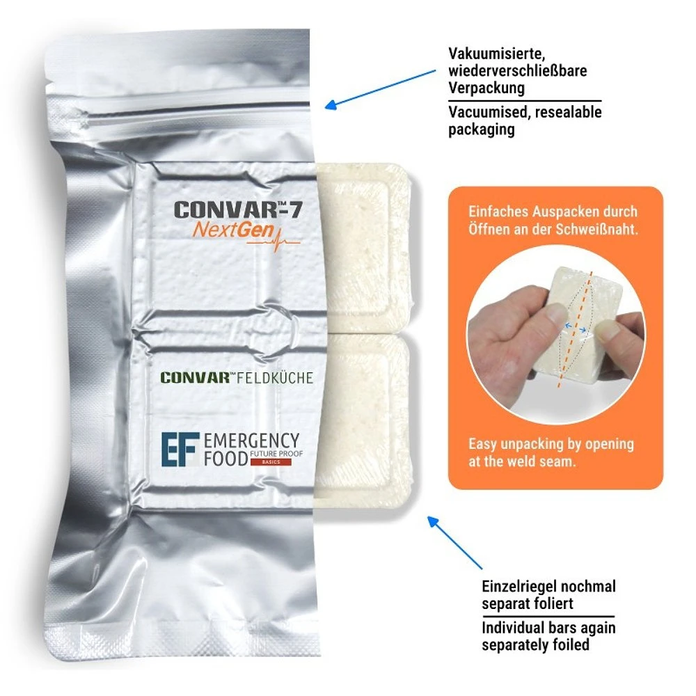 Die Notration Verpflegung entgegnet dem Hungergefühl und erhält die Leistungsfähigkeit. Die Rationen können Pur, mit wenig Wasser als Brei oder mit viel Wasser als Energytrink zu sich genommen werden.