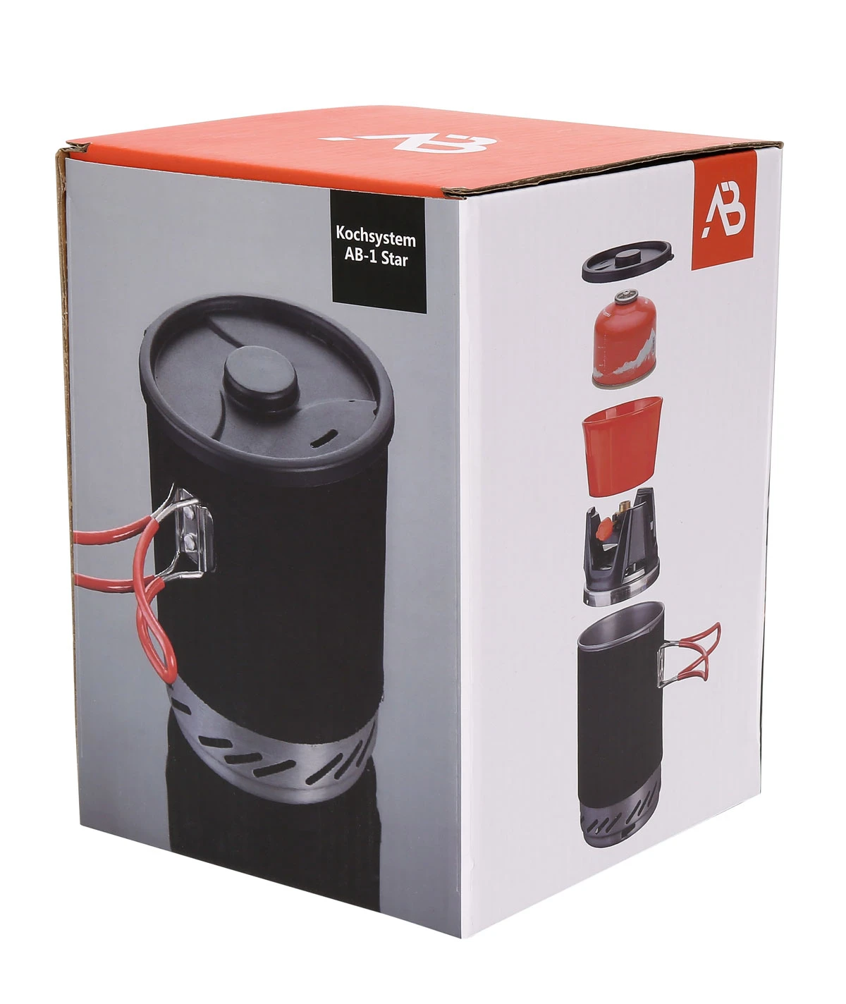 Das Outdoor Kochsystem AB-1 Star bringt ausser dem Brennstoff alles mit, was du für eine warme Mahlzeit oder eine heiße Tasse Kaffee benötigst. Der mit Neopren isolierte 0,8 Liter Kochtopf mit Wärmetauscher ist dabei zusammen mit dem breiten Brenner für Gaskartuschen unglaublich schnell und effizient im Verbrauch.