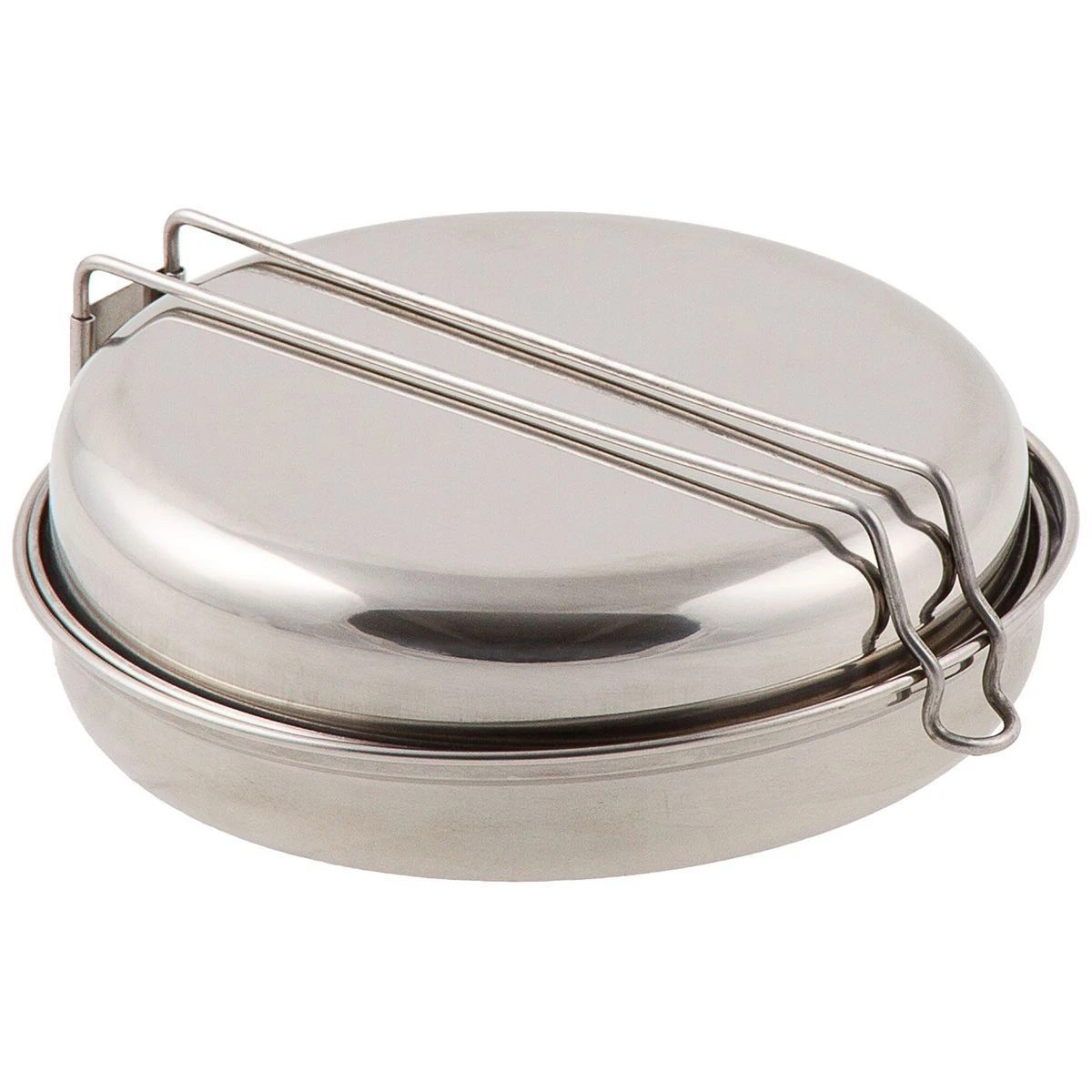 Töpfe und Pfannen für den Einsatz unterwegs sollten durchdacht konzipiert, platzsparend und robust sein. Das Outdoor- und Lagerfeuer Kochgeschirr von MFH erfüllt dabei alle Punkte mit Bravour. Das kompakte Edelstahl Kochset besteht aus 5 Teile mit Topf, Deckel, Pfanne, Schüssel und Kunststofftasse. Der Pfannengriff dient zudem als praktischer Verschluss des Sets beim Transport. Alle Teile werden zum Transport nach dem Matroschkapuppen-Prinzip ineinander gestapelt und verschlossen. Somit erreicht man ein unglaublich kleines Packmass von 19cm Durchmesser und nur 6,5cm Höhe. Das Kochgeschirr ist (bis auf die Tasse) komplett aus Edelstahl gefertigt, womit eine hohe Robustheit und eine lange Lebensauer garantiert wird. Zudem ist das Set somit rostfrei, einfach zu reinigen und lebensmittelecht.